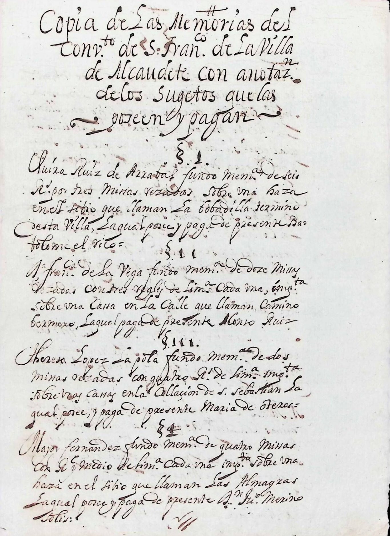 Este documento manuscrito constituye una copia de las “Memorias” del Convento de San Francisco de la villa de Alcaudete, en la que se registran con detalle las obligaciones económicas, rentas y cargas piadosas vinculadas a determinadas propiedades urbanas y rurales pertenecientes a diferentes vecinos. Se trata de un testimonio administrativo-religioso de gran valor, pues refleja la estrecha relación entre las instituciones conventuales y la sociedad local, donde numerosos particulares fundaban memorias, capellanías o rentas perpetuas destinadas al sostenimiento del culto, de los religiosos y de las obras asistenciales.