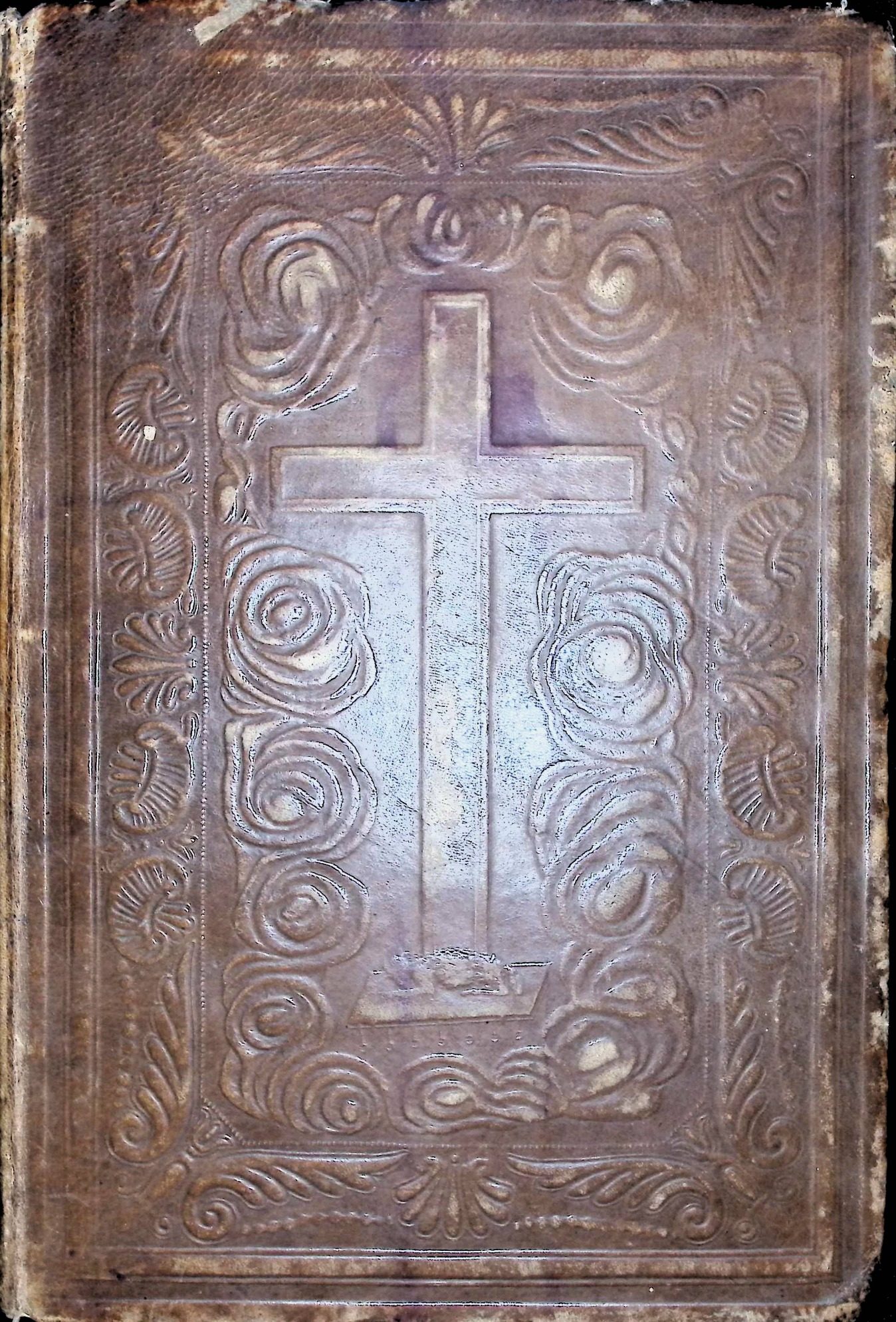 La tapa anterior muestra una cruz latina central en relieve, rodeada por una ornamentación vegetal y volutas simétricas, dispuestas dentro de un marco rectangular igualmente gofrado. El diseño responde a un lenguaje decorativo sobrio, de carácter religioso, propio de encuadernaciones devocionales del siglo XIX. No se aprecia policromía; la decoración se basa exclusivamente en el trabajo del relieve y el contraste de luces sobre la superficie gastada.