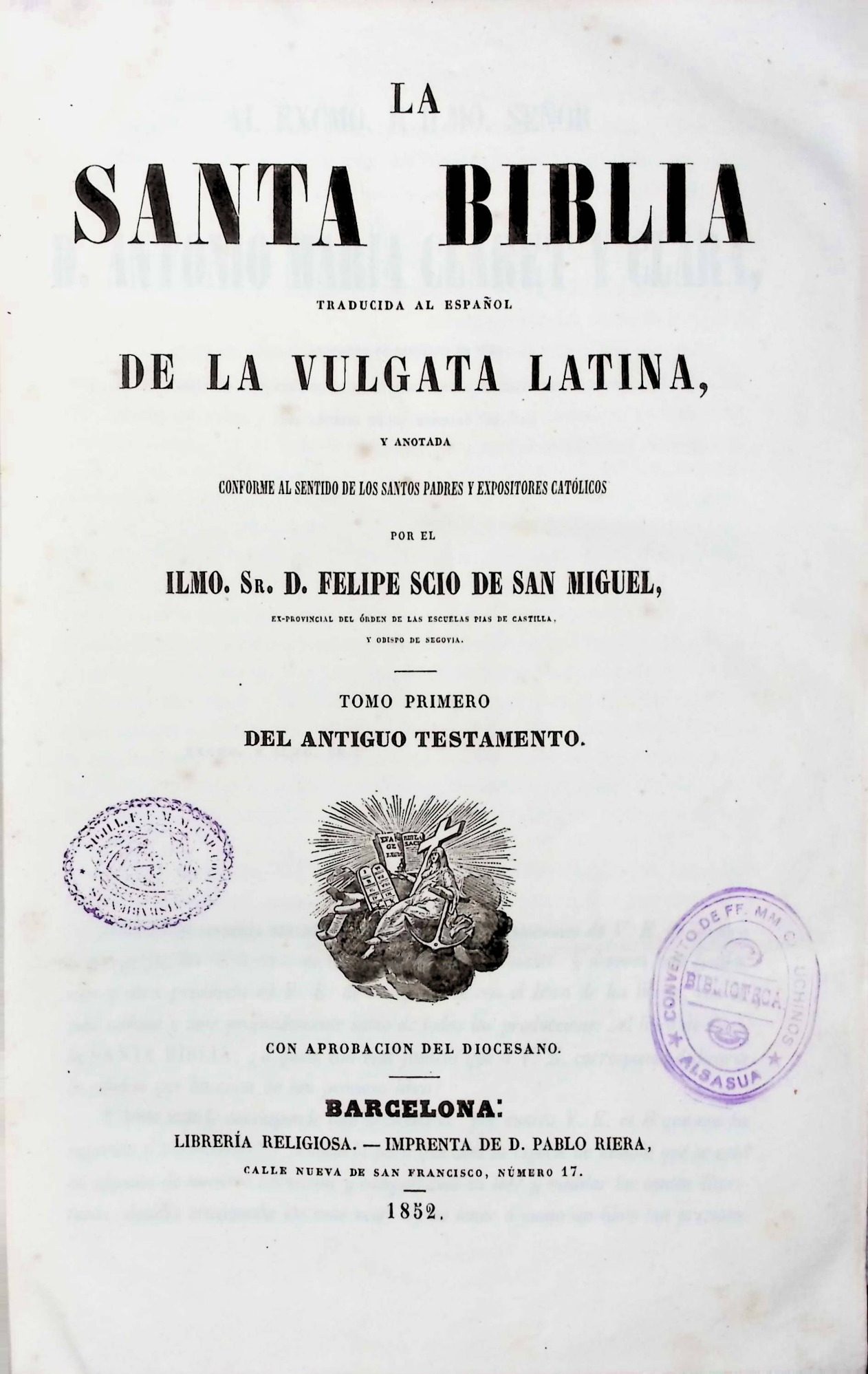 Se indica que la obra está traducida al español de la Vulgata latina y anotada conforme a la doctrina católica, atribuida a Felipe Scio de San Miguel. En la parte inferior figuran los datos de impresión: Barcelona, Librería Religiosa – Imprenta de D. Pablo Riera, 1852. La página incluye sellos de biblioteca en tinta violeta, lo que indica su pertenencia a una institución y su circulación histórica.