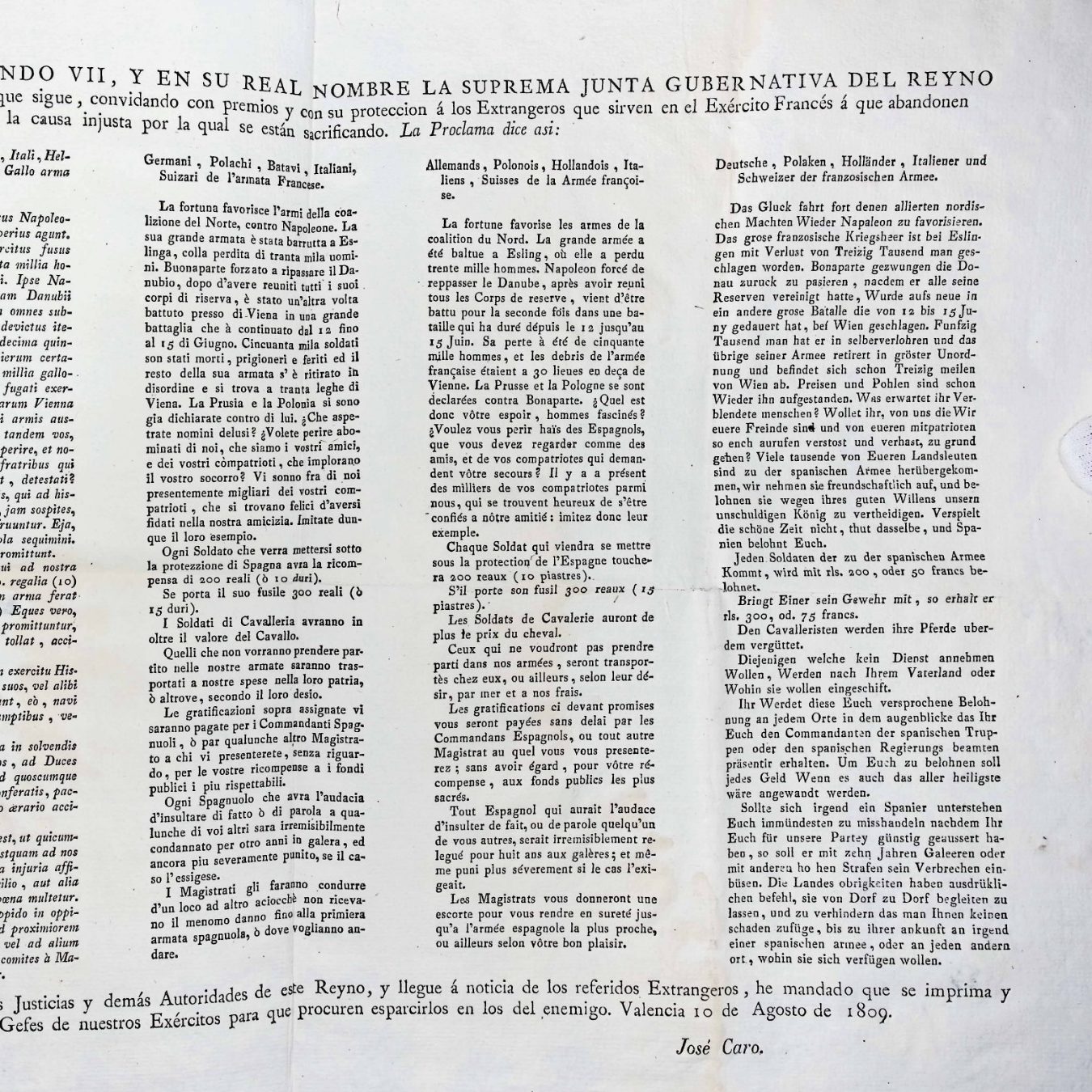 La proclamación aparece impresa en varios idiomas, demostrando la clara intención de que fuese comprendida por los diferentes contingentes extranjeros al servicio de Francia. También deja ver que la guerra no era exclusivamente hispano-francesa, sino parte de un conflicto europeo más amplio en el contexto de las Guerras Napoleónicas.