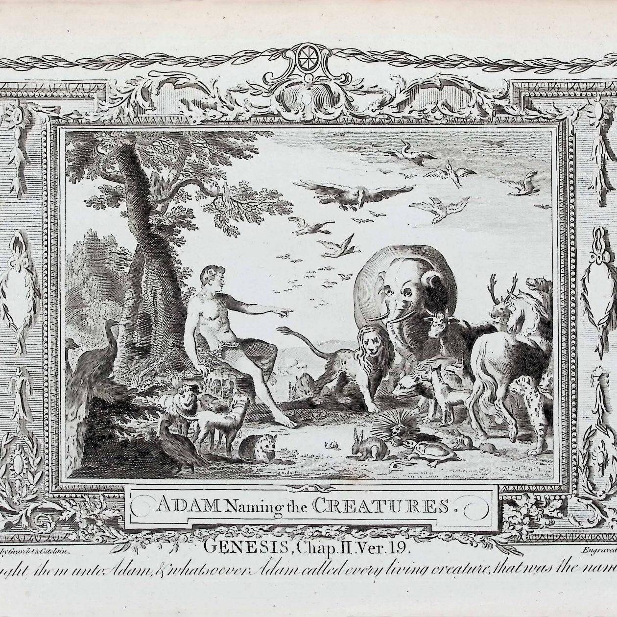 “Adam Naming the Creatures”, acompañado de la referencia bíblica “GENESIS, Chap. II Ver. 19” y una frase explicativa que transcribe el sentido del versículo.