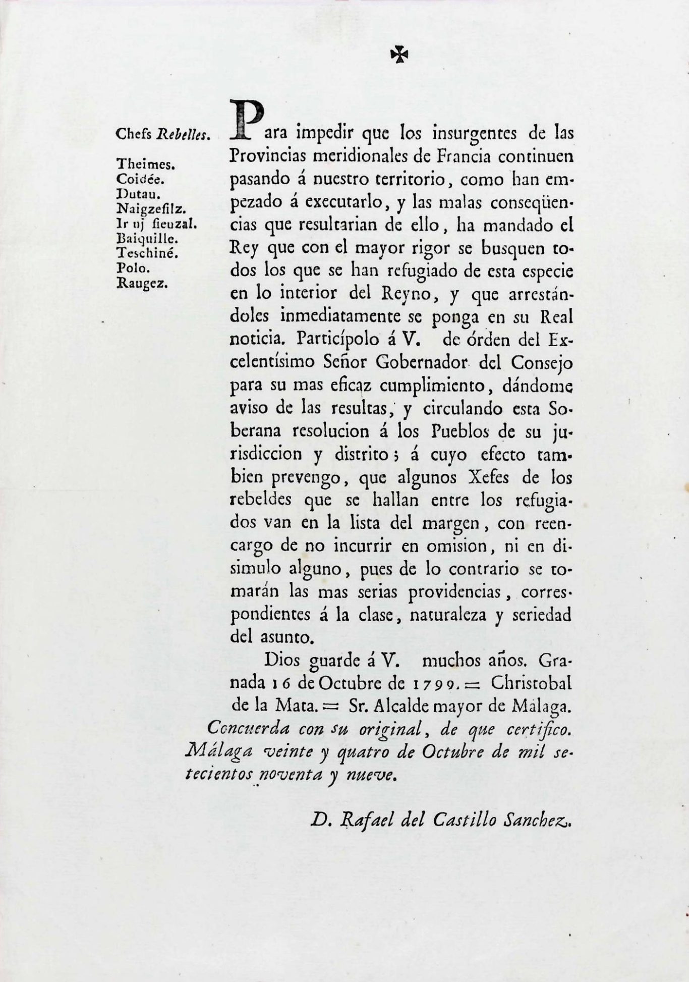 Granada, 16 de octubre de 1799 (emisión de la orden)