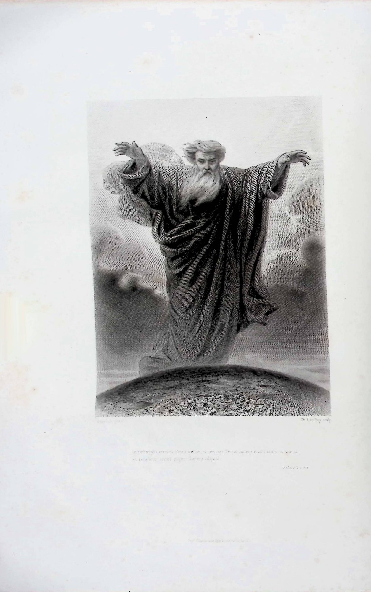 La tercera imagen corresponde a una lámina ilustrada, impresa a página completa, probablemente mediante grabado calcográfico o litografía. Representa una figura masculina de carácter divino, con barba larga y vestiduras amplias, emergiendo entre nubes, con los brazos elevados en actitud de bendición o creación. La figura se sitúa sobre una superficie curva que sugiere el mundo terrenal.