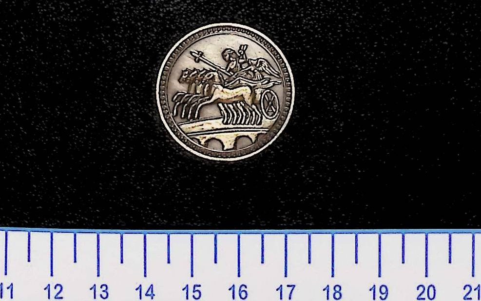 El reverso está ocupado por la representación de una cuadriga, con cuatro caballos avanzando de manera sincronizada, captados en una escena de gran dinamismo. El auriga sostiene las riendas y un atributo de mando, subrayando la idea de victoria y control. La composición es equilibrada y clara, con figuras bien diferenciadas pese al reducido tamaño de la pieza, demostrando un cuidado notable en la ejecución del relieve.