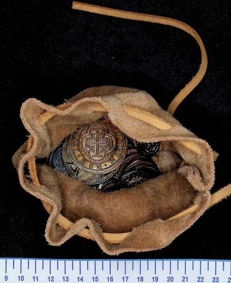 En las imágenes donde la bolsa aparece abierta se observa el interior, que carece de forro, mostrando el reverso del cuero con su textura más áspera. En su interior se aprecian varias monedas, lo que ilustra claramente la función primaria del objeto como contenedor monetario. Las costuras, discretas y poco visibles, refuerzan las uniones sin alterar la estética sobria del conjunto. No se aprecian elementos decorativos añadidos, lo que refuerza su carácter utilitario y su adecuación a un contexto cotidiano medieval.